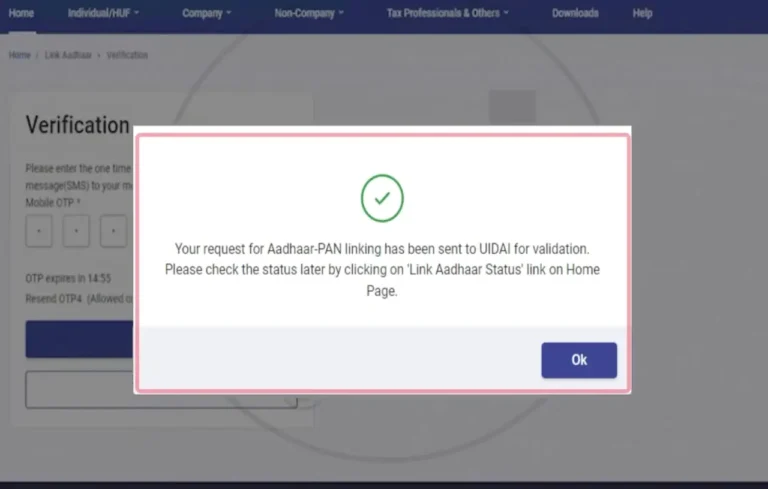 Step 13:- As soon as you enter the OTP, your request to link your PAN card and Aadhaar card will be successfully completed. Within a few hours, your Aadhaar card and PAN card will be linked, and you will also be notified via a message.